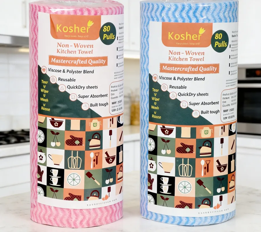 Kosher Non-Woven Kitchen Towels are made using a high-grade viscose and polyester fibre blend, carefully engineered to deliver superior performance in daily kitchen tasks. This advanced non-woven construction gives the towel a fabric-like strength while keeping it lightweight, flexible, and easy to use — making it a reliable companion for modern kitchens.