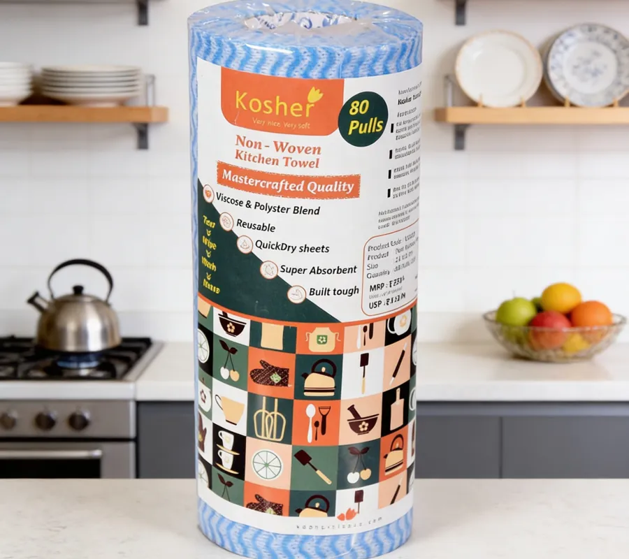 Kosher Non-Woven Kitchen Towels are made using a high-grade viscose and polyester fibre blend, carefully engineered to deliver superior performance in daily kitchen tasks. This advanced non-woven construction gives the towel a fabric-like strength while keeping it lightweight, flexible, and easy to use — making it a reliable companion for modern kitchens.